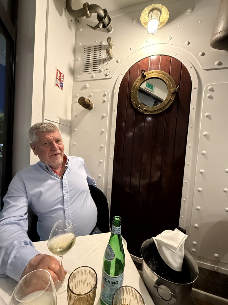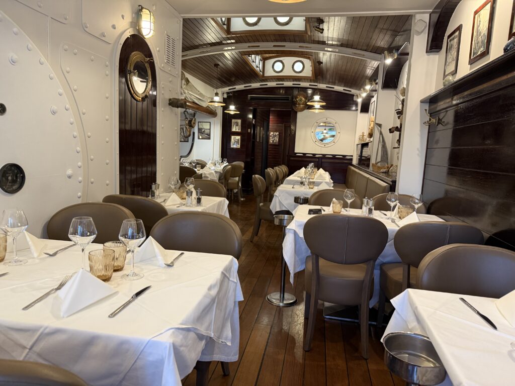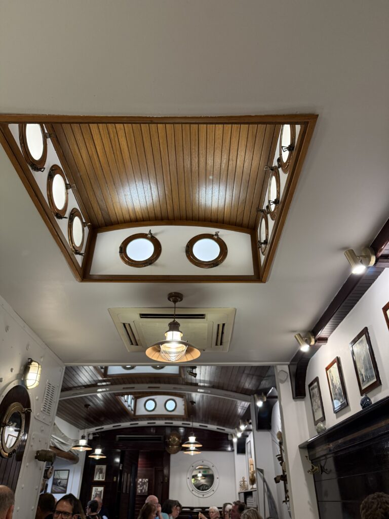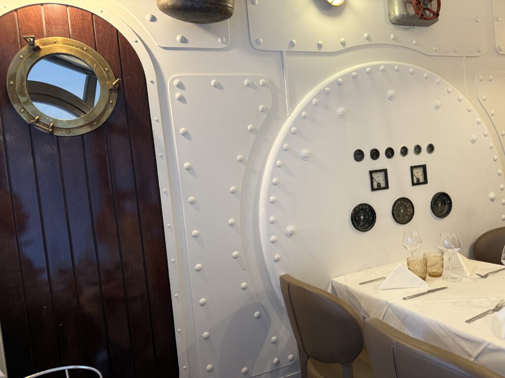 Kvällens restaurang som vi bokat var en skaldjurs och fiskrestaurang som också ligger väldigt nära vår lägenhet här i gamla stan. Restaurangen heter L’oursin och är väldigt coolt inredd. Ulf sa säkert 4-5 ggr. hur mycket han gillade inredningen. Den var nämligen inredd som en båt med väldigt autentiska detaljer.
