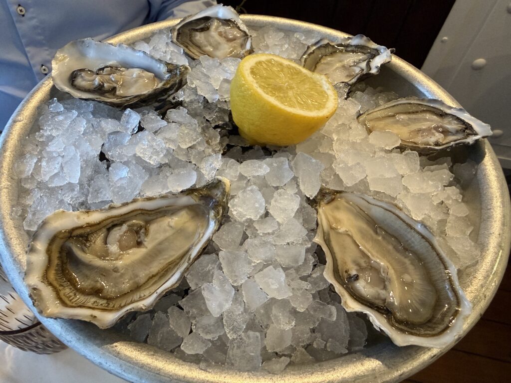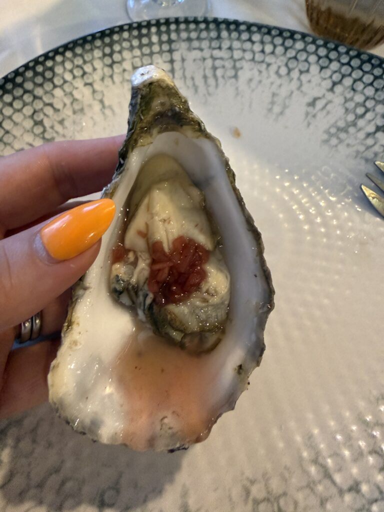 När vi fick in ostronen så tog vi först två var, mina var helt okej, inte bästa kvalité men okej. Då säger Ulf att hans ostron ”smakar bajs”. Vi diskuterar detta en stund, vad det kan bero på och undrar om vi ska dra på oss matförgiftning nu också😱 När vi ska ta det sista ostronet så är man ju inte supersugen, trots att mina två varit bra. Då smakar även mitt sista ostron ”bajs”. Vi tänker att det känns lite som att det har med tång att att göra, då lukten och smaken känns lite samma. Har kollat upp detta lite idag.