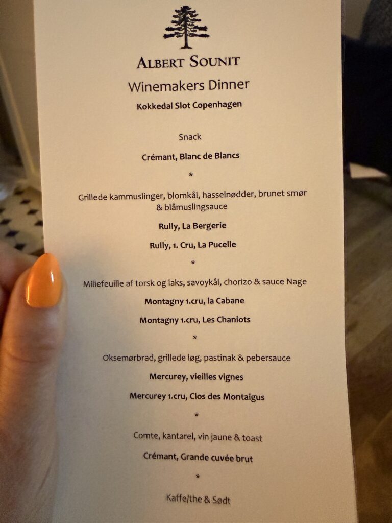 Vinmakaren som representerades vid middagen var Albert Sounit, som kommer från nära Côte de Beaune i Bourgogne. Det serverades två olika viner till vissa av rätterna, för att kunna känna vilket man själv tyckte passade maten bäst.