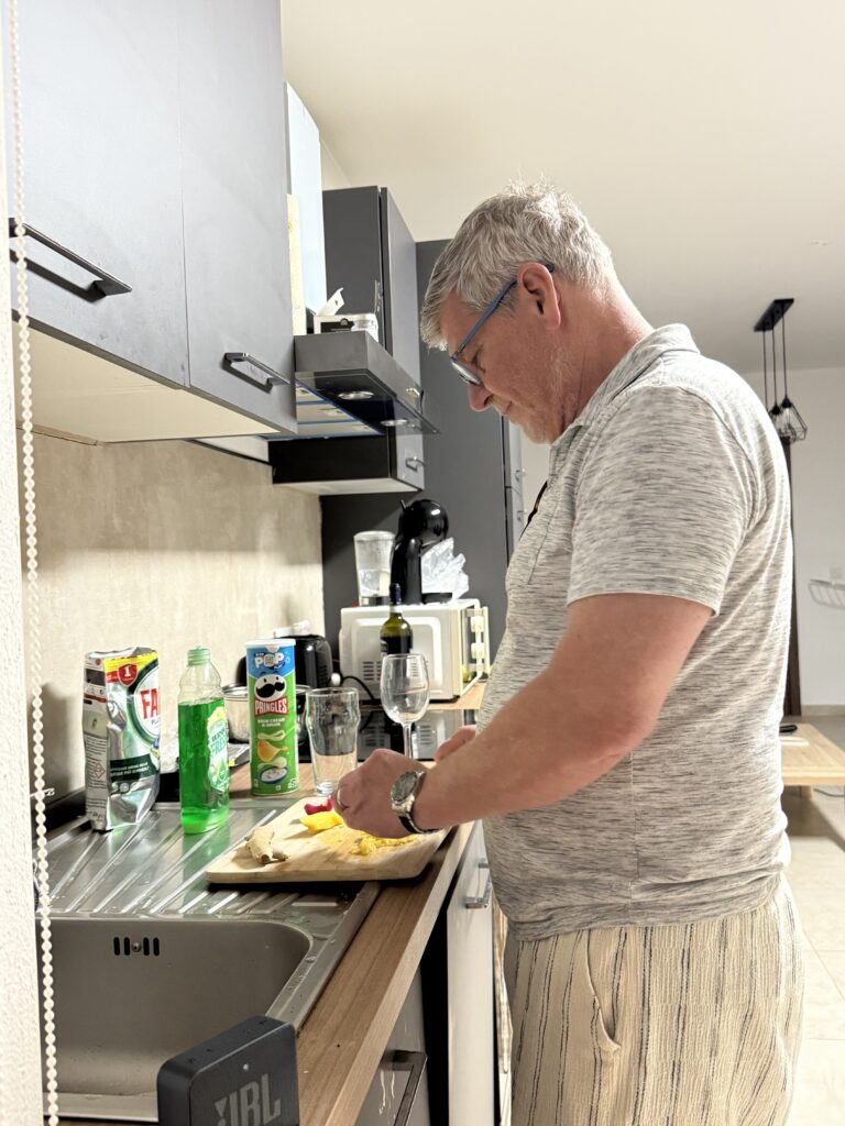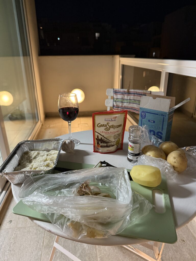 Det är en utmaning att hitta lösningar när köket i vårt boende är sjukt dåligt utrustat, inte ens en gratängform fanns. Stekpannor och grytor har plasthandtag, så de kan inte sättas in i ugn. Så vi fick köpa folieformar. Jag satte mig på terassen för att skala och skära tunna potatisskivor för hand, finhacka vitlöken, då det inte heller finns någon press osv. Medan Ulf jobbade i köket med förrätten.