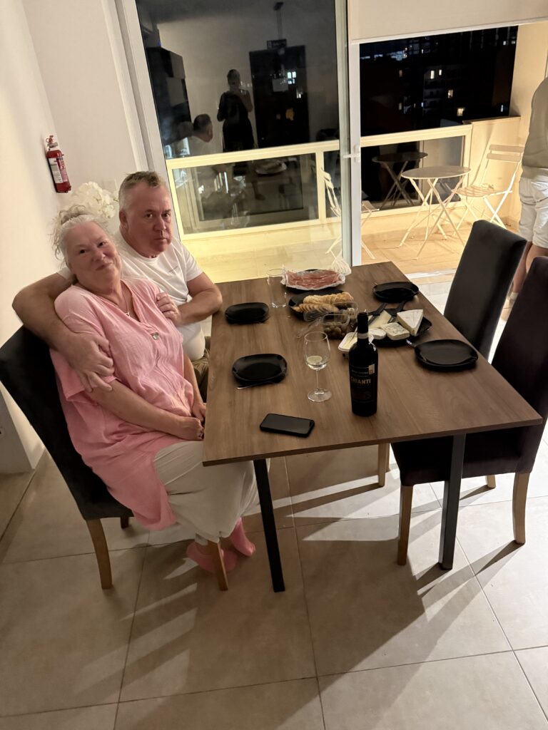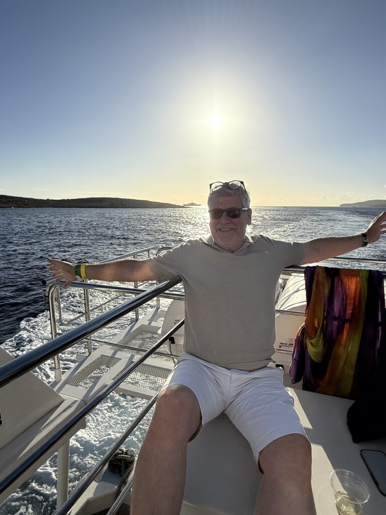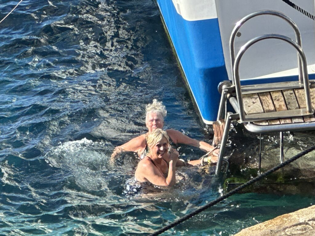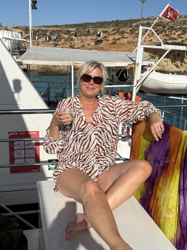 Sedan var det vidare till Comino och den blå lagunen. Där blev det en liten uppdelning av oss fyra. Ulf och Magnus tog trapporna upp på ön, köpte varsin öl och satt och njöt av utsikten. Deras utsikt var bland annat deras badande fruar som stannat nere på båten för att kunna ta ett dopp i den blå lagunen. SEdan blev det en härlig stund i solen med lite vin.