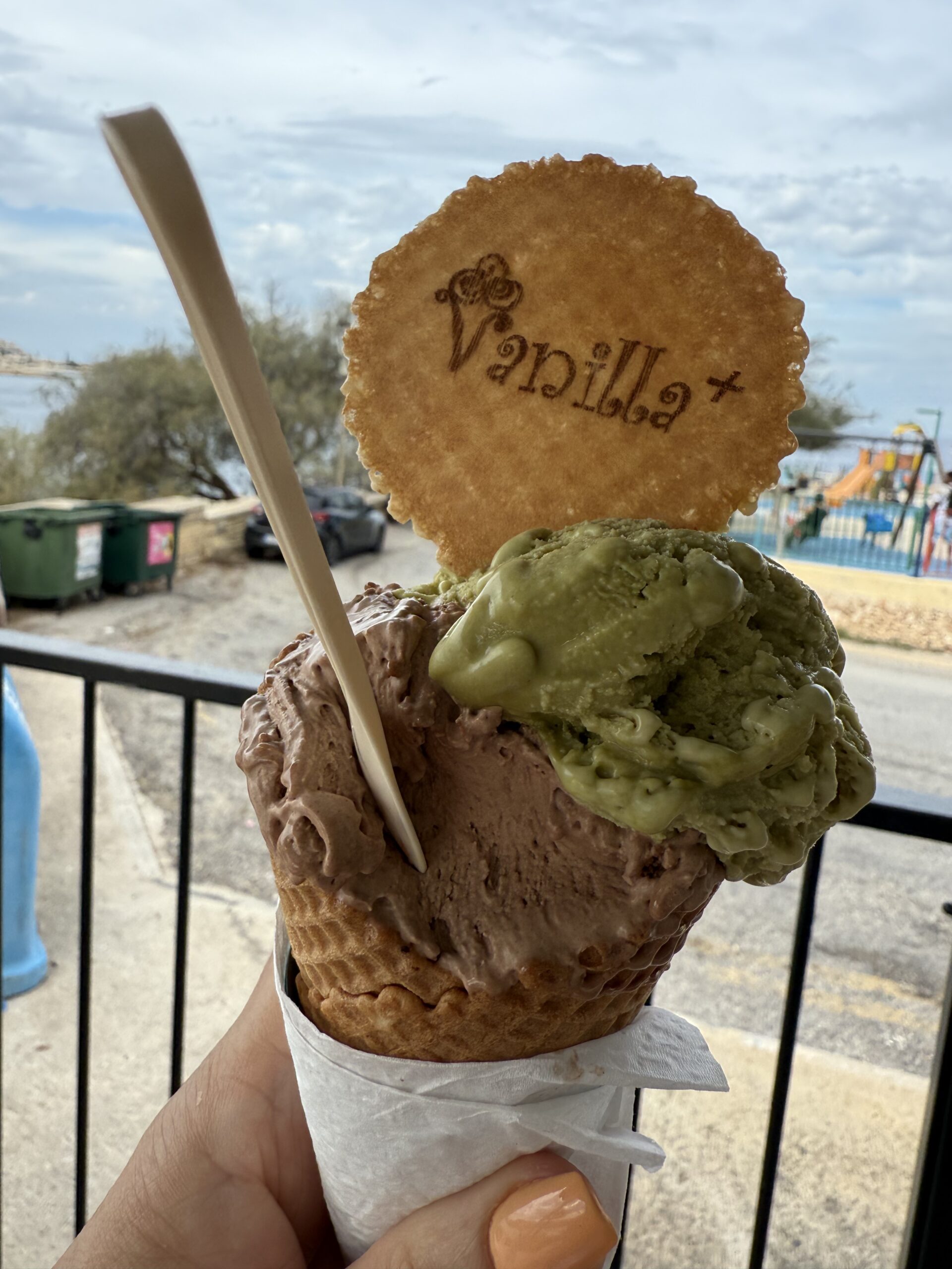 Idag var jag lat och sov länge, vaknade med ett ryck klockan 9.45 och for upp. Annars har jag vaknat runt 6.30 varje morgon. Kan vara gårdagens vinpaket som slog ut kroppen lite idag. Idag var det fix med tvätt och strykning, mycket skrivande här i bloggen. Passade också på att ligga en halvtimme på solbädden med en feel good-bok i öronen. På eftermiddagen gick vi en långpromenad i ytterligare nya områden, där det också blev en glasspaus utmed vattnet.