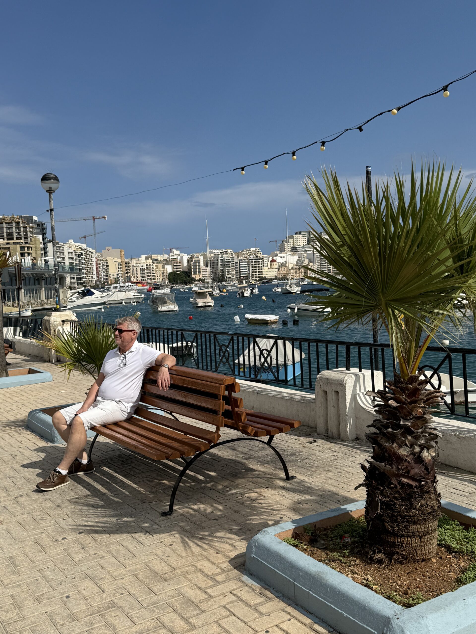 Vi började med en frukost ute i solen på vår ena terass. Vår frukost var enkel med Crispbread, ägg, räkost på tub, vatten och te, men vilken njutning att få sitta ute i 24 graders solsken och äta frukost den 16:e oktober. Hade man dessutom min plats, så ser man också en liten snutt av havet mellan husen. Ett absolut ”MÅSTE” på alla resor, ett par tubar med räkost. Så även denna gång.