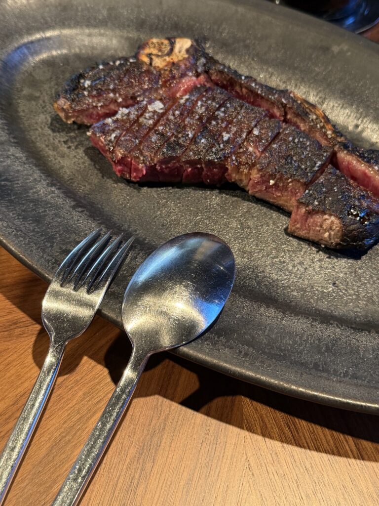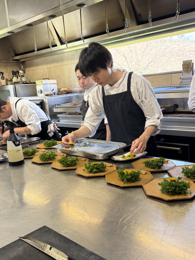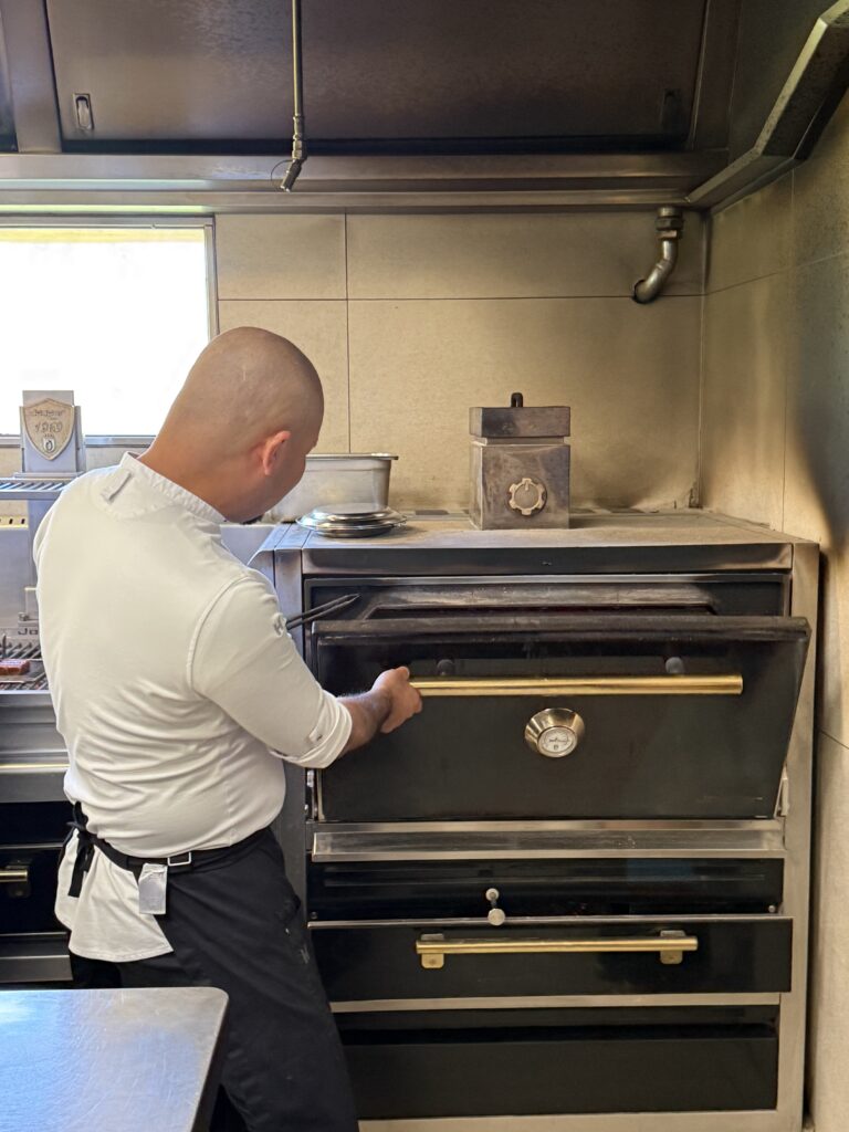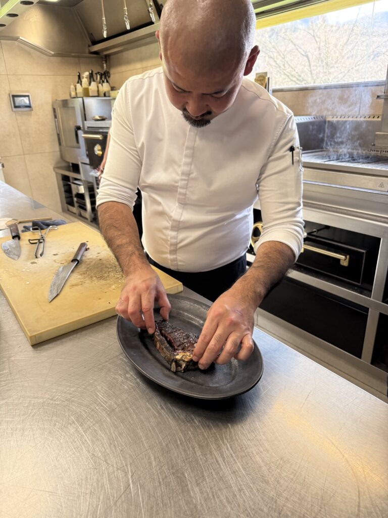 Sedan fick vi gå ut i köket och titta på när vår nästa rätt: Txuleta med sallad grillas av Chef Tetsuro.