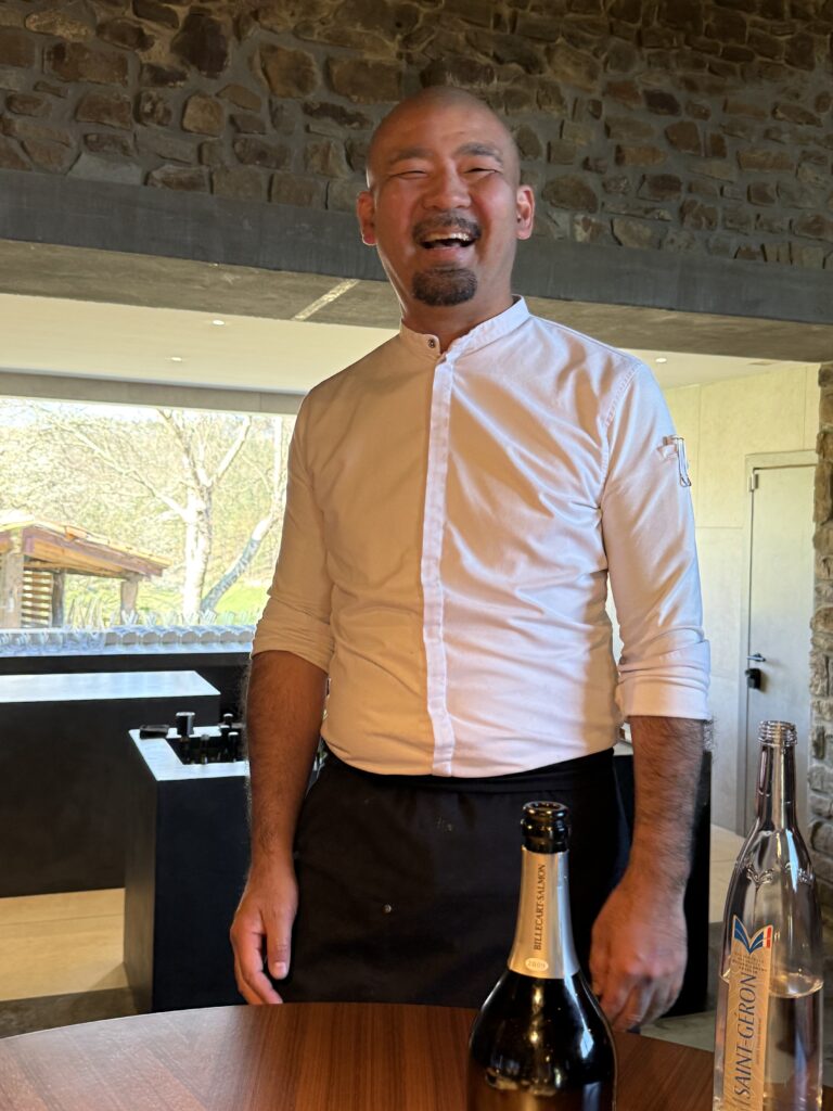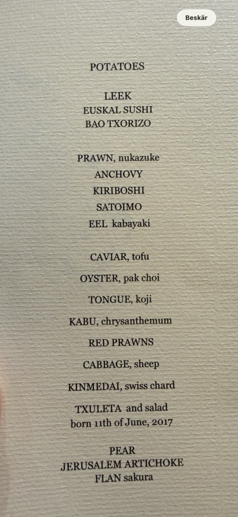 Sedan blev det även Champagne och lite starters utomhus. Innan vi fick gå ut i köket och hälsa på kocken och få ytterligare några goda munsbitar. Alltid kul att få komma ut i köket och se det pågående arbetet med tillagning och upplägg. Det spännande med denna restaurang är att man mixar Japanska smaker med traditionella baskiska smaker, vilket blir spännande och annorlunda kombinationer. I de allra flesta fall, var detta en fantastisk kombo, men för mitt tycker, ett par dippar av dessa 20 serveringar.