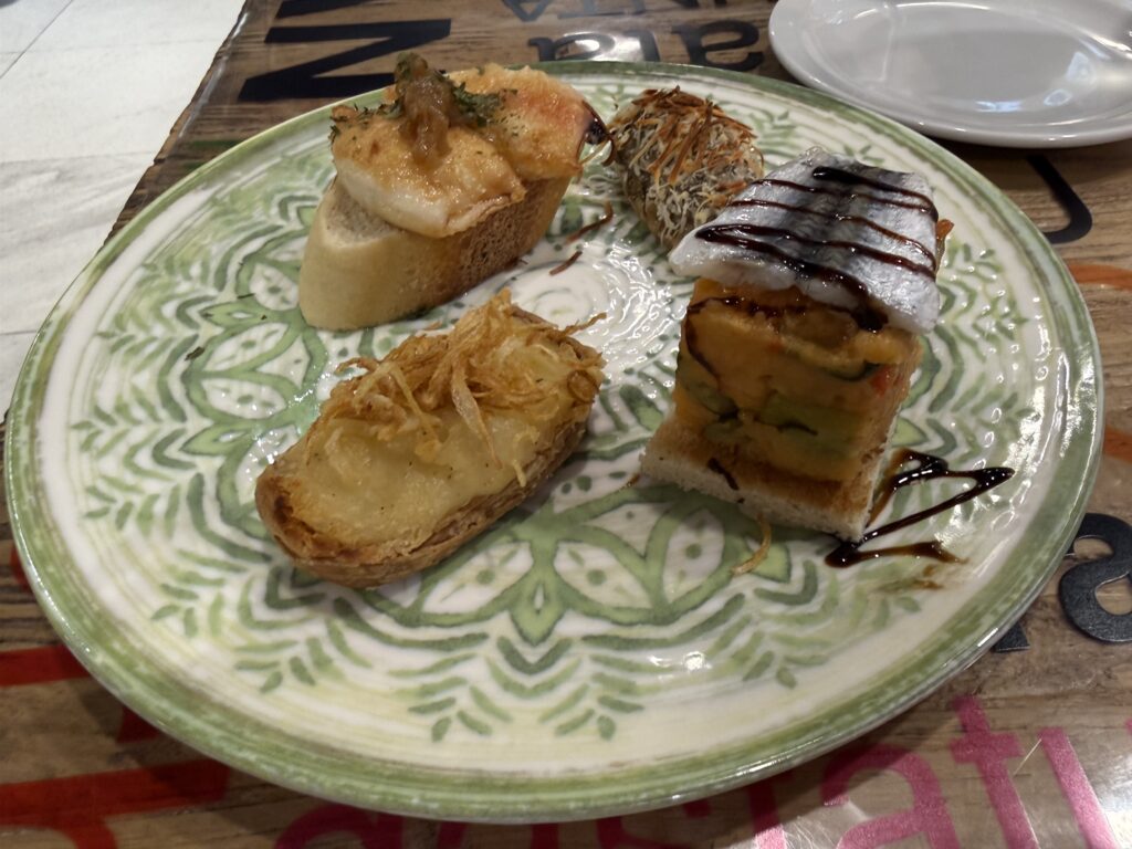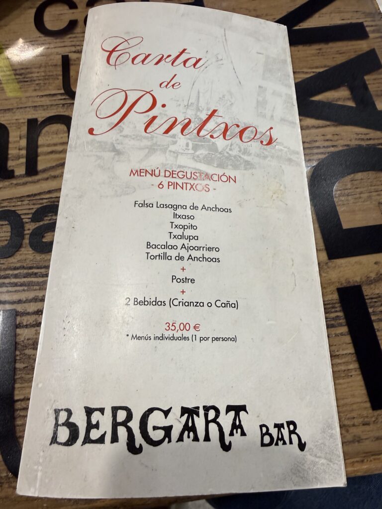 Nära vår parkering låg nämligen ett ställe som vi hört om och ville prova, Bergara bar. Dessutom är de lite mer frikostiga med öppettider här i San Sebastián. Också här blev vi lite besvikna. Ulf tog en förutbestämd ”smakmeny” av pinxtos, medan jag valde två andra. Mina var rätt goda, men Ulf var lite besviken på sina. Dessutom lite nonchalant och tråkig personal.