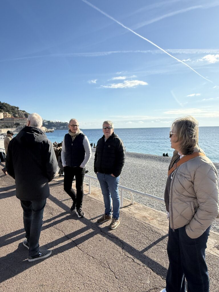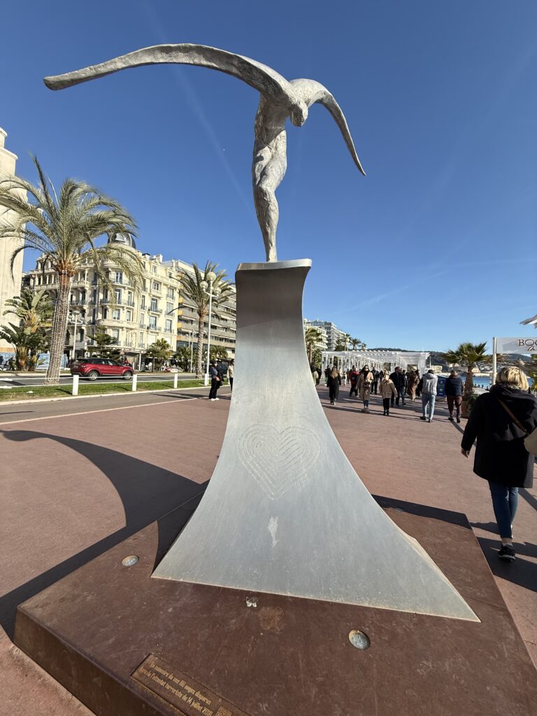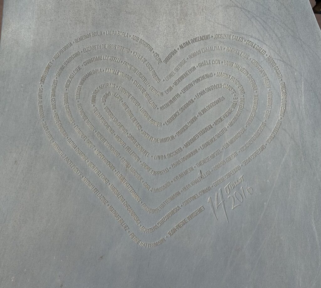 Innan vi skulle bege oss till Sanremo för att inspektera ett av våra nya boenden, så åt vi frukost, packning och tog sedan ännu en härlig promenad på Promenade des Anglais i Nice. Vi passerade minnesmonumentet för de 84 omkomna vid terroristattentatet på Nationaldagen 2016. Alla namnen på de omkomna är inristade i hjärtat.