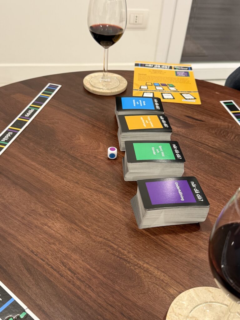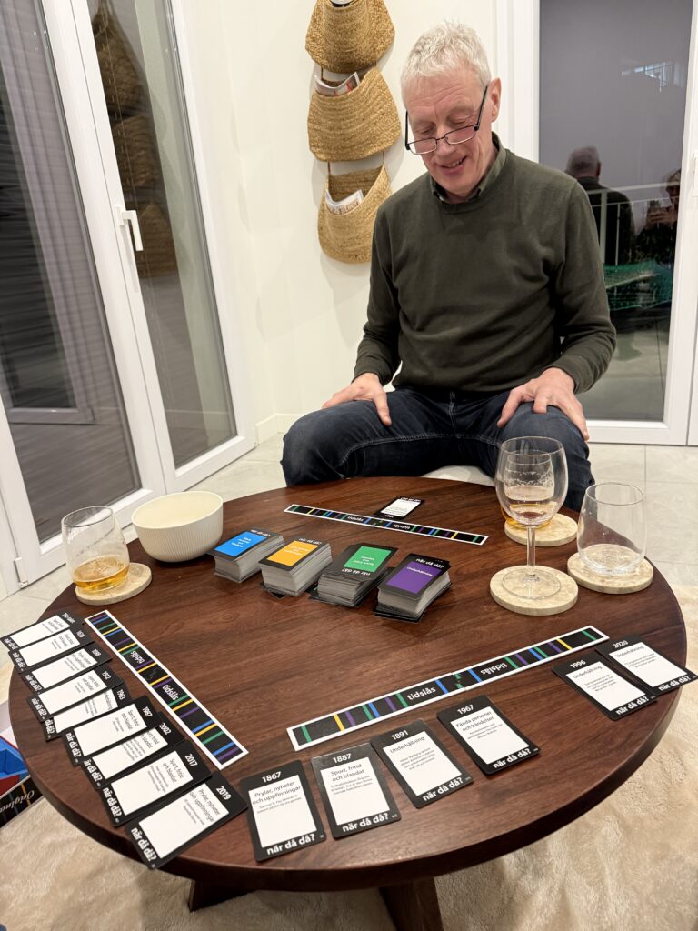 På kvällen gick vi ner till centrum och åt en Nyårsdagspizza. Därefter ”storhandlade” vi och tog en taxi hem från tågstationen. Vid taxiupphämningen hittade vi en mobiltelefon liggandes på marken, som Lars försökte lämna in på stationen. De vägrade ta emot den. Sedan blev det spelkväll ”hemma” med sällskapsspelet ”När då då”. Om man har spelat det här spelet tidigare så talar bilderna för sig själv om hur det gick i spelet.