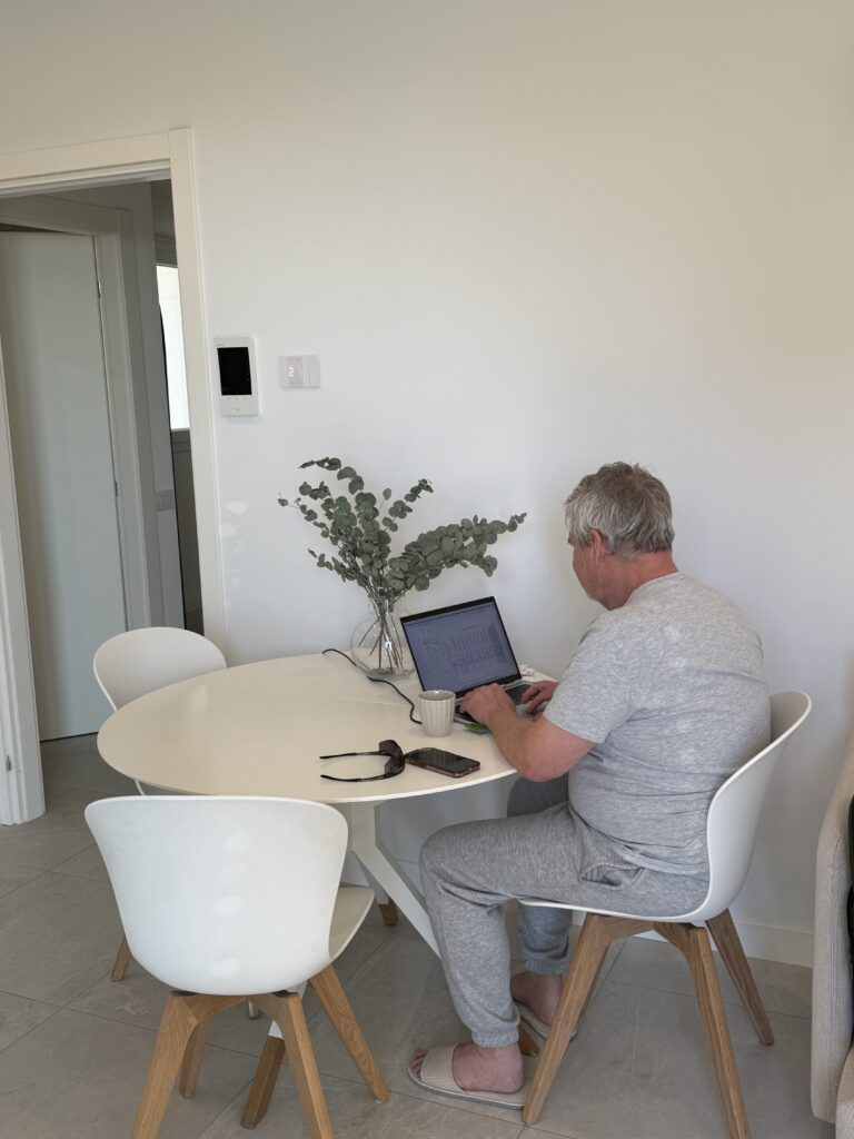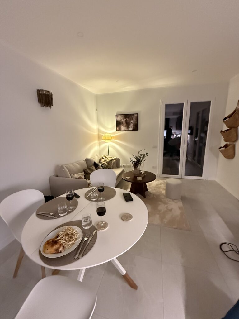 Sedan var det då dags att bege sig till vårt boende i Sanremo. Vi tog tåget som med byte tog knappa två timmar. Därefter taxi från stationen då vår lägenhet ligger en bit upp, där det är kuperat. Vi blev avsläppta på fel adress (long story) och fick putta stora resväskor i uppförsbacke sista biten. Väl på plats är allt till stor belåtenhet. Då detta är nybyggda lägenheter, så visade det sig att vi tre är de första av delägarna som bor här. Allt är sprillans nytt och fint. Väldigt välutrustat och genomtänkt och med en enormt fin utsikt från båda terasserna. Filmen visar stora terassen, den lilla är utanför masterbedroom.