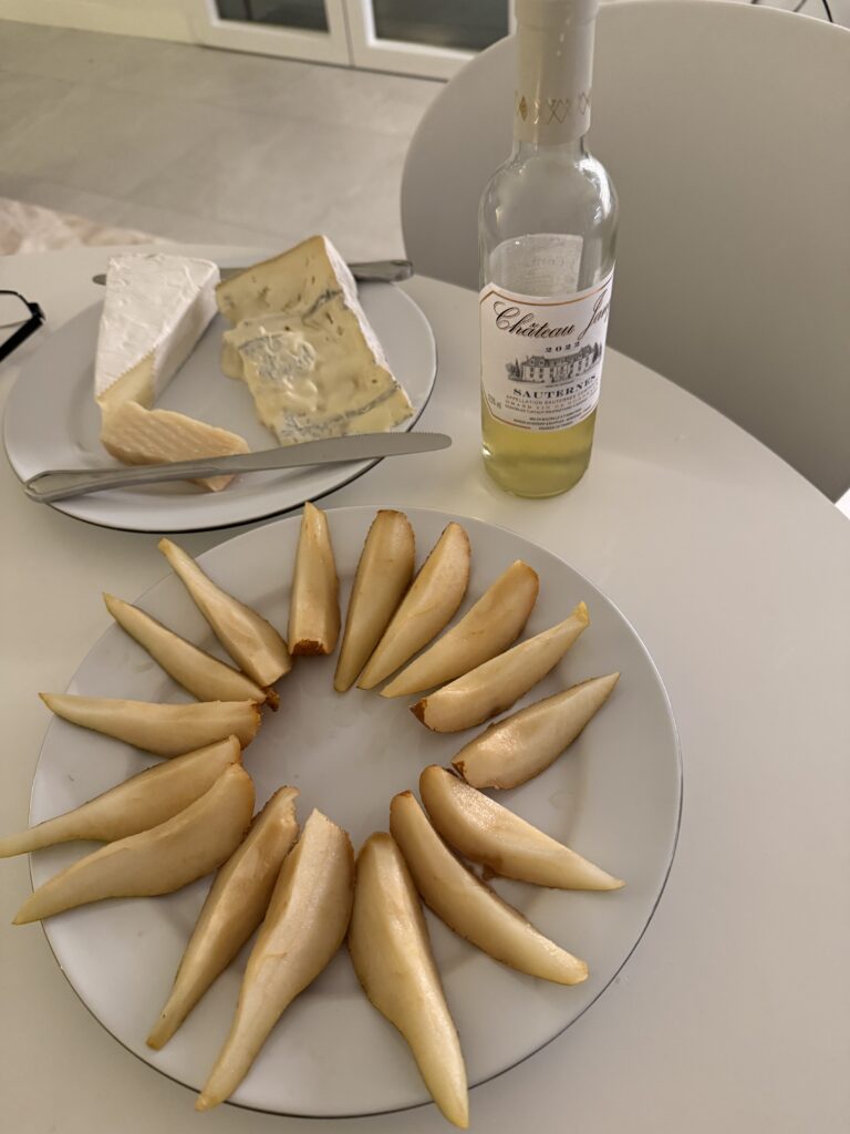 Dessert: Ostar (Gorgonzola, Brie och Parmesan) med goda päron och hemgjorda parmesankex.