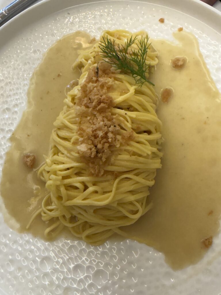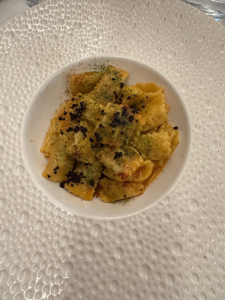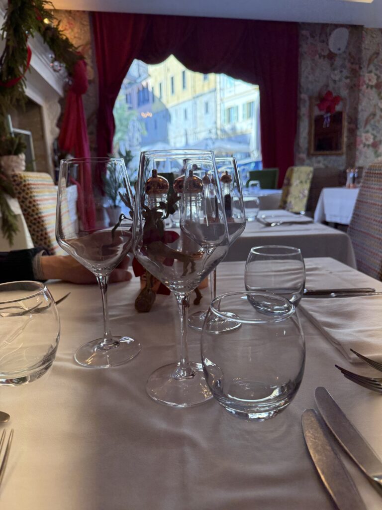 Detta ställe var så charmigt och ombonat, det visade sig vara populärt också, alla bord var upptagna dessutom stod det ett par damer och väntade i kö när vi skulle gå. För att ni ska få se lite av inredningen så har jag lånat en bild av Tripadvisor. Maten var mycket god och vi åt alla en förrätt som hette Egg 63, ett perfekt tillagat ägg till 63 grader med tillbehör som jordärtskockschips och svart tryffel b.la. Sedan valde vi lite olika varmrätter. Jag valde en kycklingravioli, Lars åt ankbröst och Ulf åt någon pasta med anjovis. Kanhända så slank det ner en flaska god Barbera de Nizza till detta också, när vi ändå var igång.