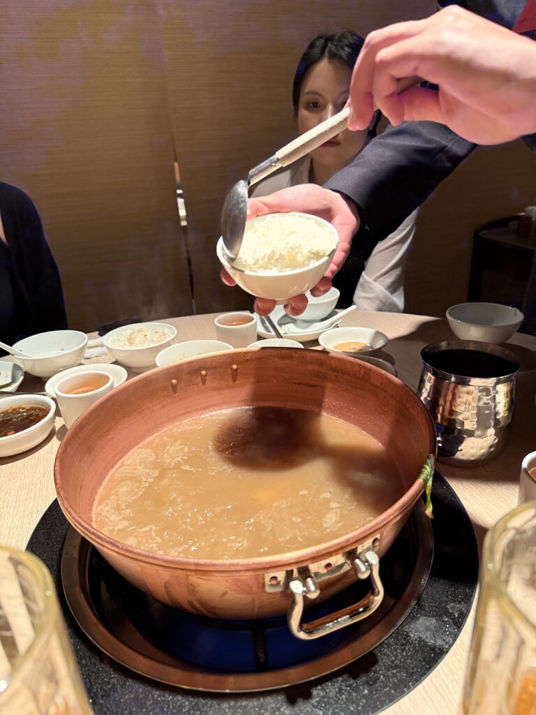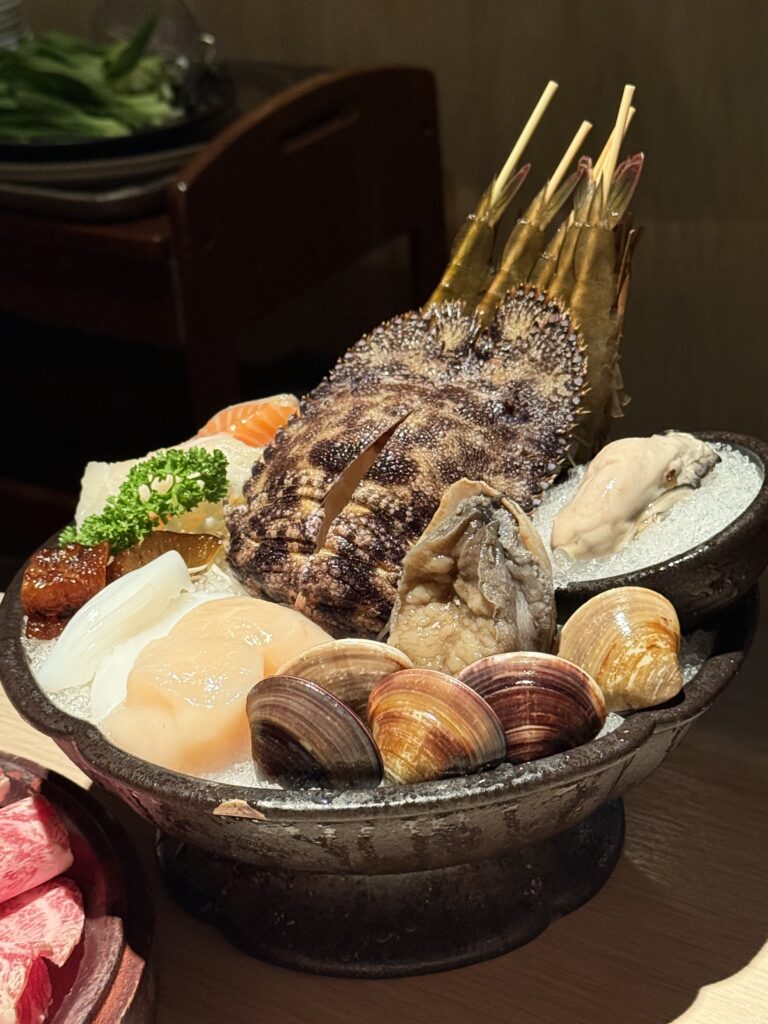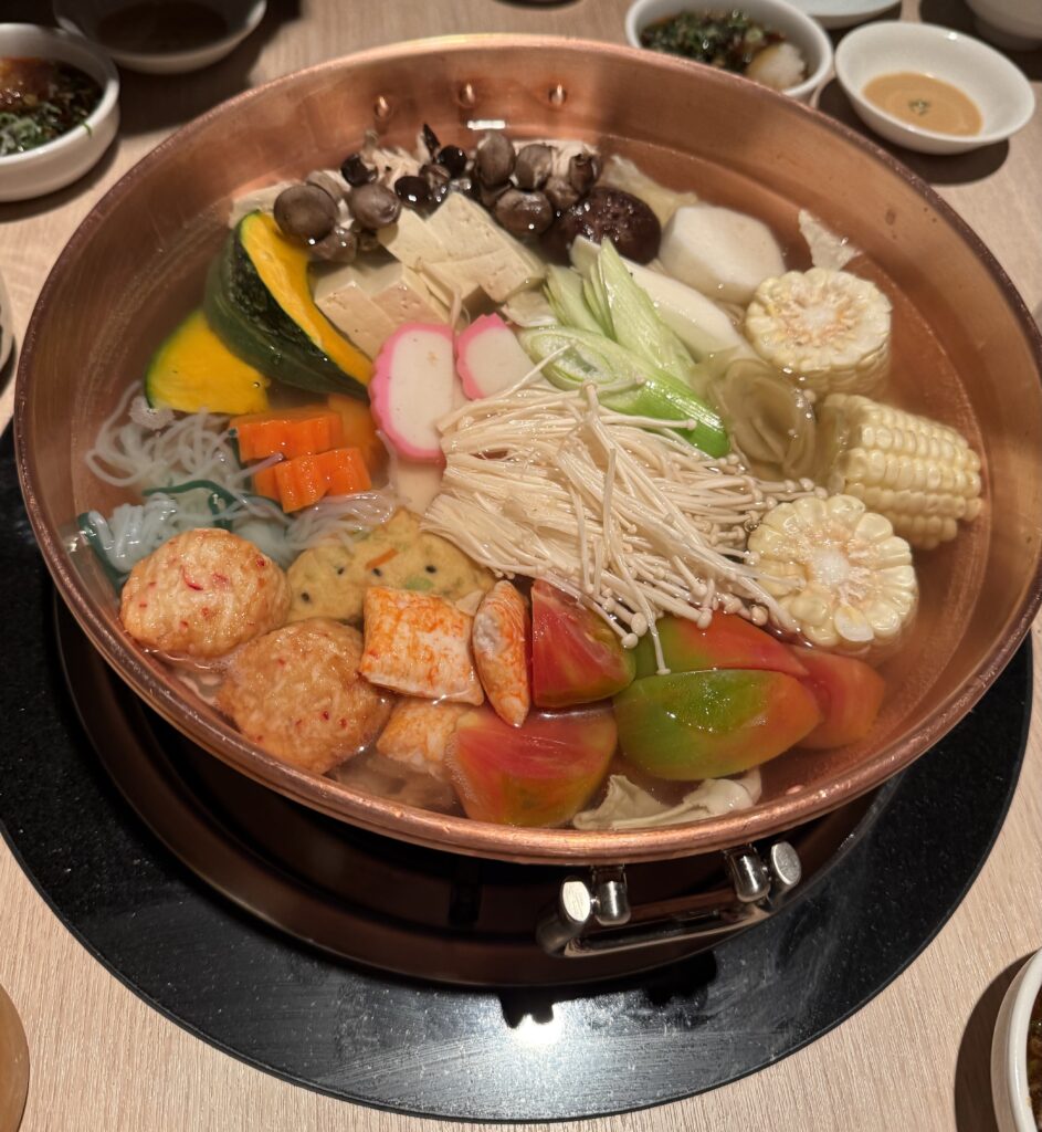 Vi var verkligen på semester. Det var en person som hela tiden hjälpte oss att lägga i och ta upp all mat vid rätt tillagningstid. Servicen var fantastisk. Först gick alla grönsaker och svamp i buljongen, sedan gick det i skaldjur och fisk.